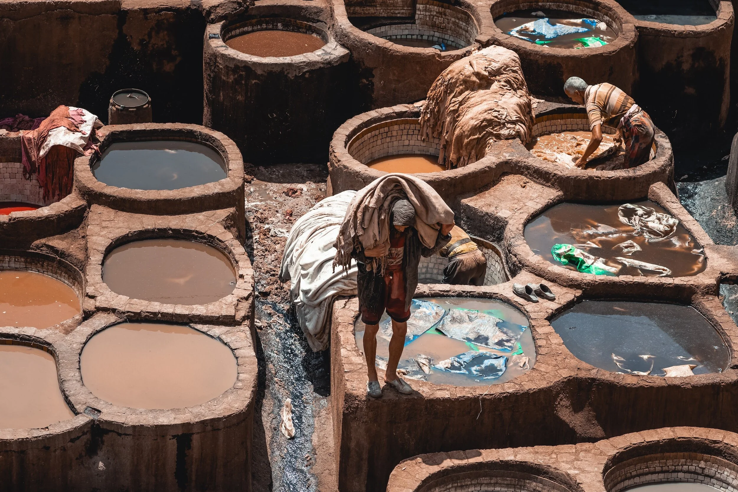 Curtidurías de Chouwara. Observar el proceso de curtido de cuero en los zocos de Fez es una experiencia única te permite conocer una tradición centenaria. Si bien no se cobra entrada por ver el proceso, los artesanos esperan que compres algo de lo que ofrecen. Es una de las postales de La Medina, donde debes prepararte para los olores que emanan del proceso. Cada tienda tiene una terraza con vistas a los pozos que están repletos de tintes de colores. Los precios son súper convenientes y no encontrarás mejor cuero en todo Marruecos.